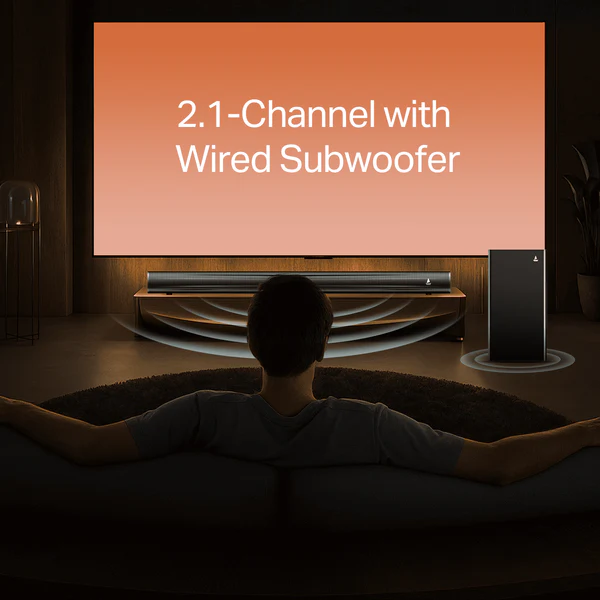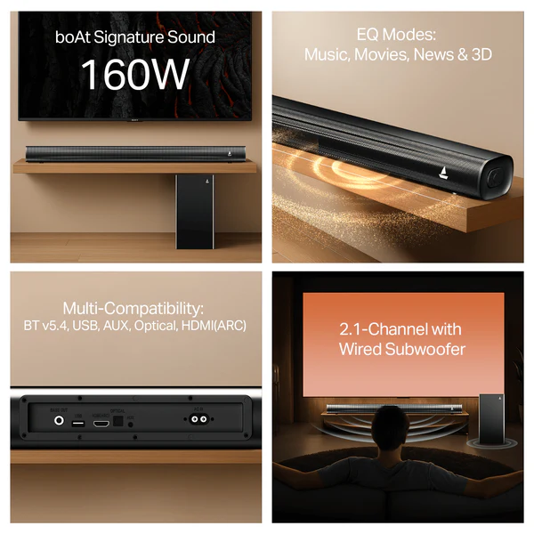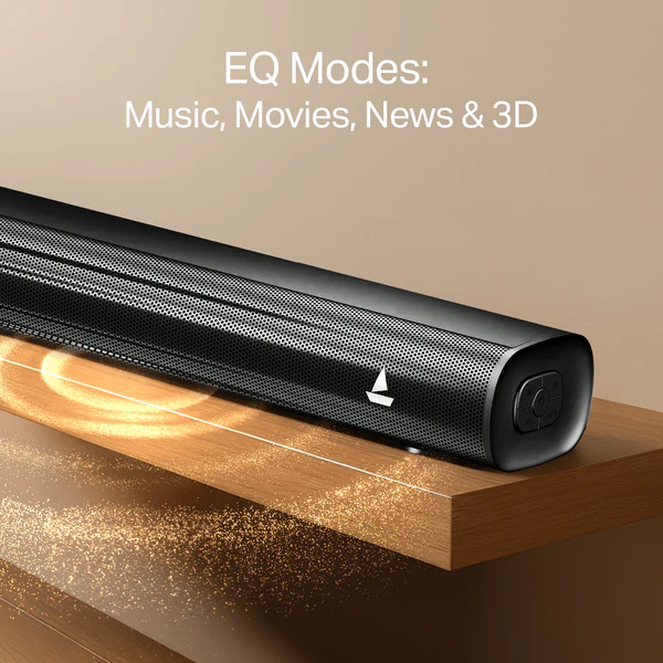The boAt Aavante Bar 1550 Plus is a high-performance 2.1 channel soundbar designed to deliver a sophisticated audio experience with a focus on depth and clarity. It features a masterfully crafted soundbar paired with a dedicated wired subwoofer, together producing a robust output that enhances the dynamic range of your home entertainment. The system is engineered with the boAt Signature Sound profile, ensuring that every dialogue is crisp and every action sequence is impactful. With its sleek, premium finish and versatile connectivity options, it serves as an ideal central hub for your television, gaming console, or mobile devices.