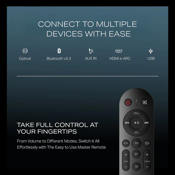 Master Remote Control: Allows you to effortlessly manage volume, switch EQ modes, and fine-tune bass and treble settings.