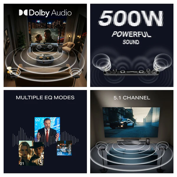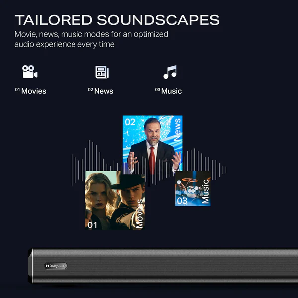 Customizable EQ Modes: Allows you to switch between specialized sound profiles for Music, News, and Movies using the included master remote.