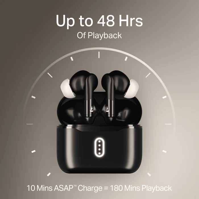 The boAt Airdopes 148 is a versatile pair of true wireless earbuds that prioritize long-lasting performance and high-quality communication. Equipped with 8mm dynamic drivers, it delivers the signature boAt sound, characterized by deep bass and crisp clarity that enhances every musical detail. Its standout feature is the massive playback capability, ensuring you can enjoy your playlists, movies, and calls for days without needing a recharge. Additionally, the integration of ENxâ„¢ technology ensures your voice remains clear during calls by filtering out background noise, while the quick-charging capabilities make it a reliable choice for those with a busy, on-the-go lifestyle.