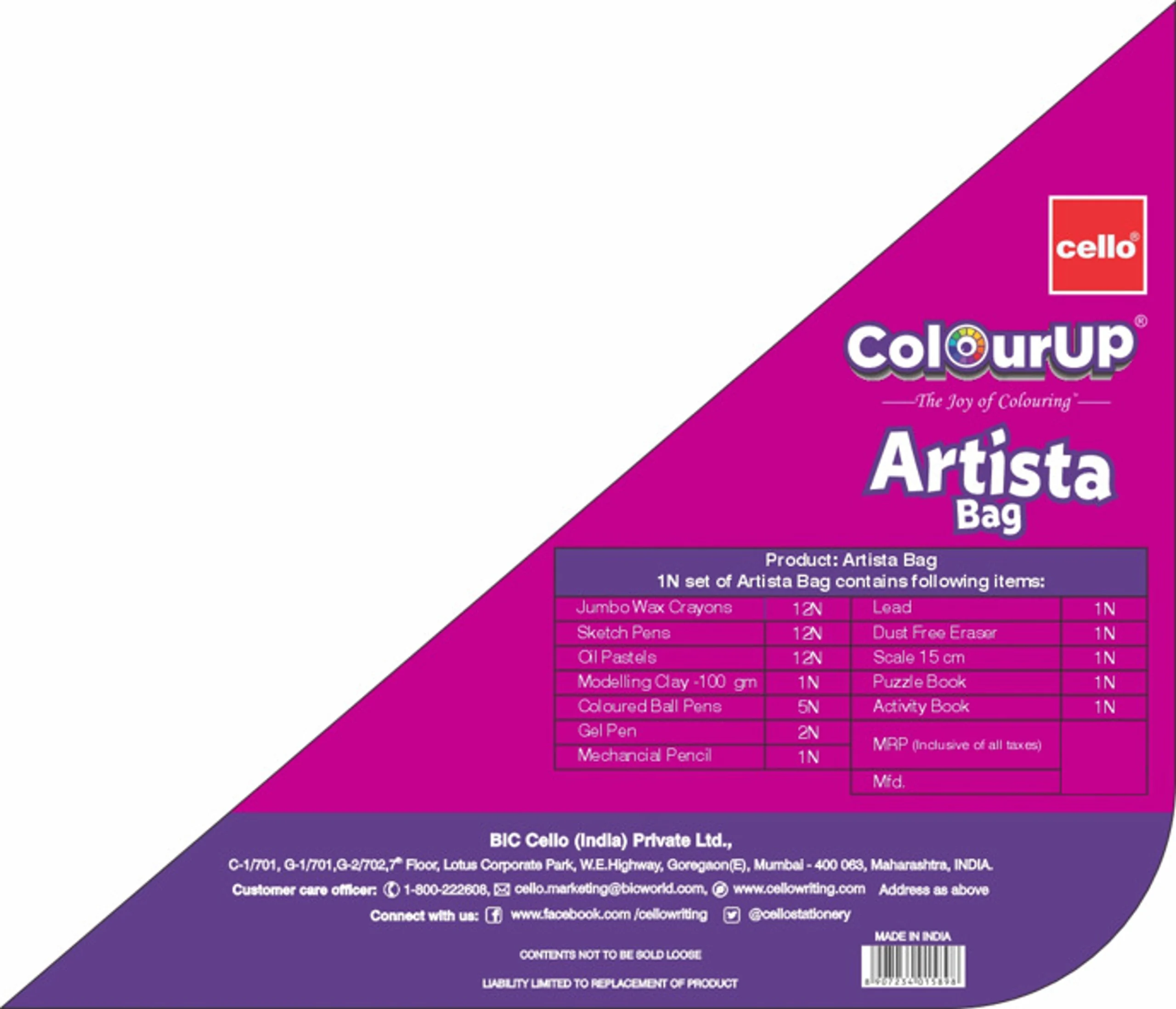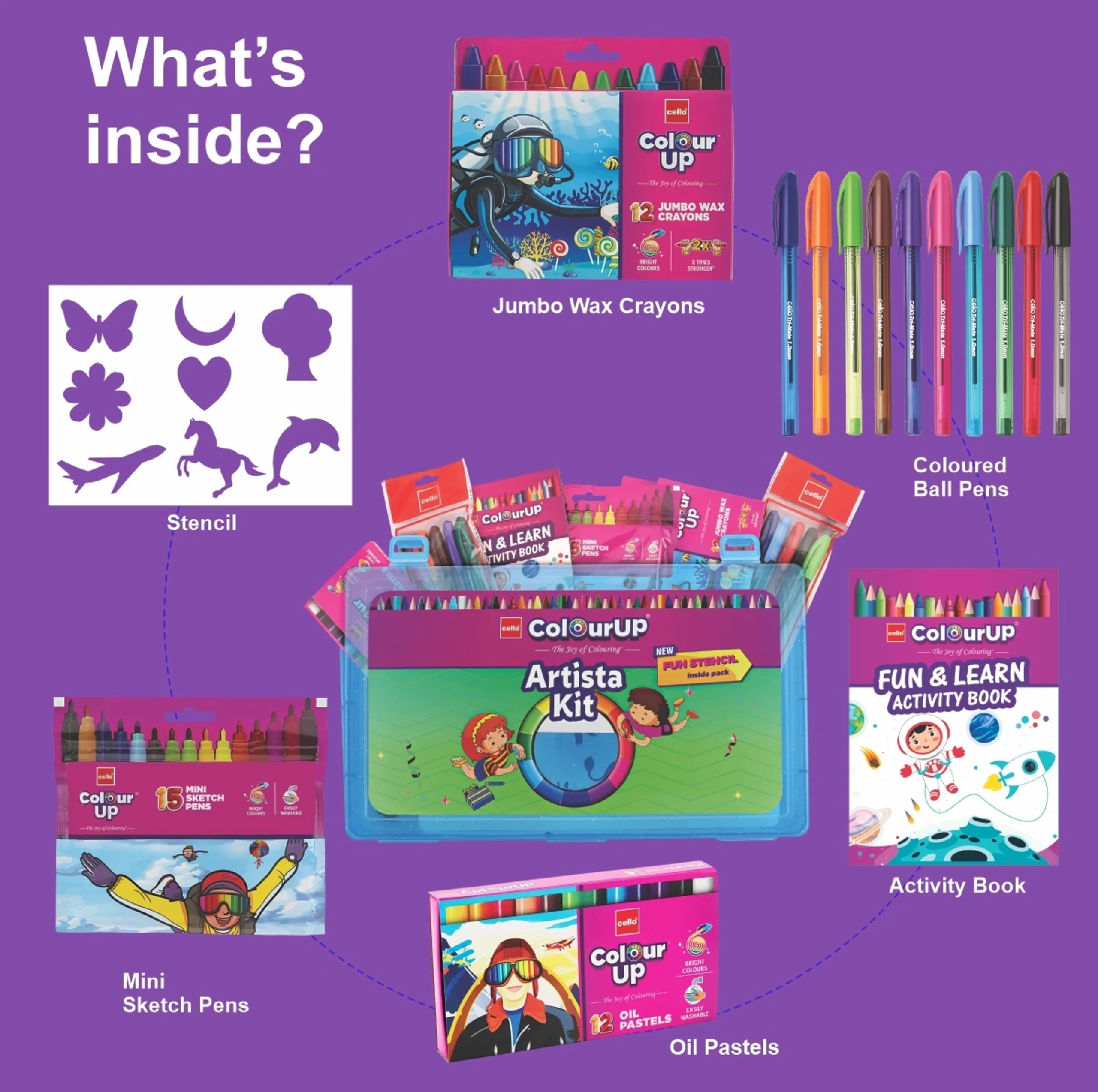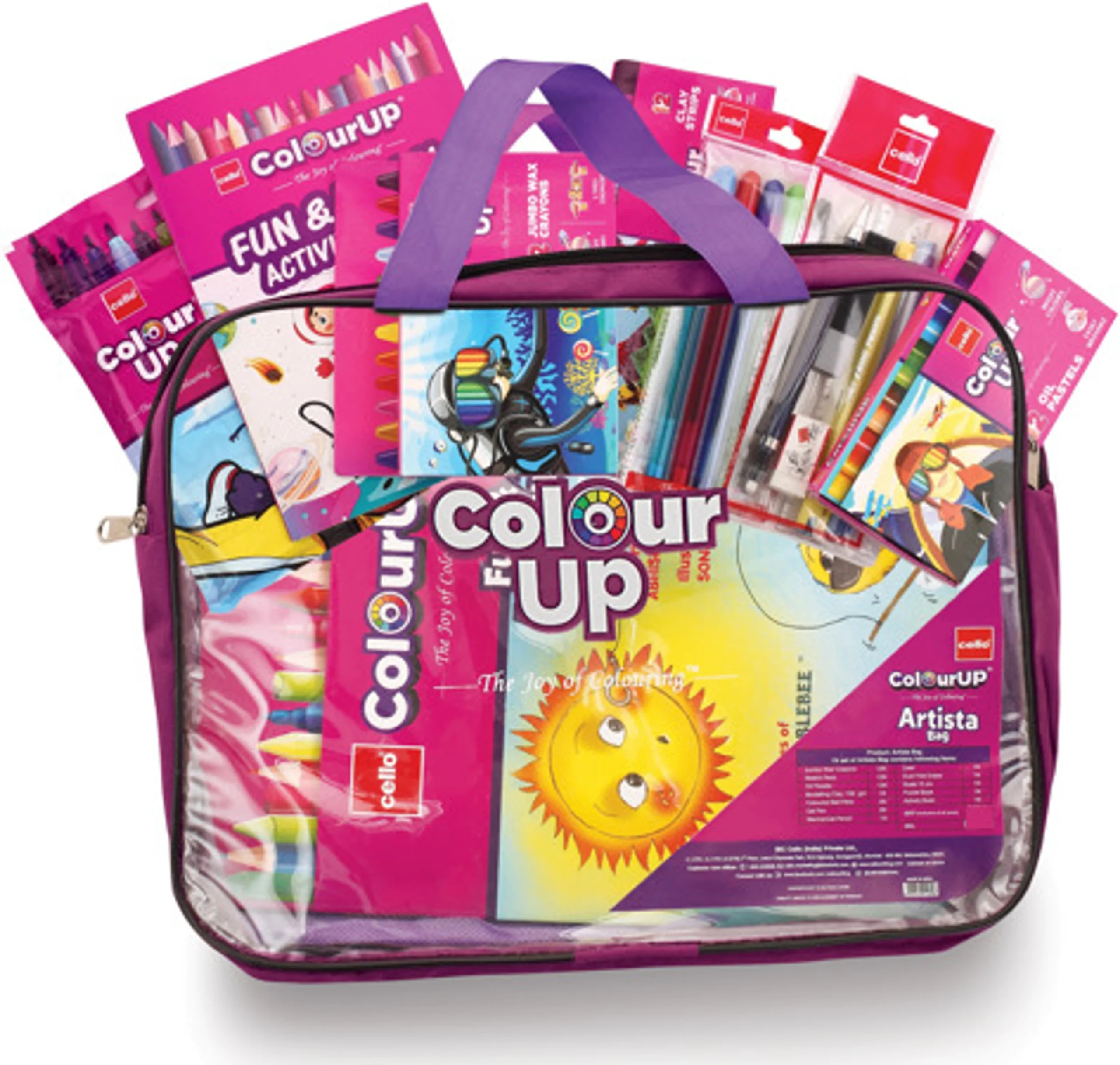 Diverse Art Supplies: The bag typically includes oil pastels, jumbo wax crayons, sketch pens, and colored gel pens for different drawing and coloring styles.