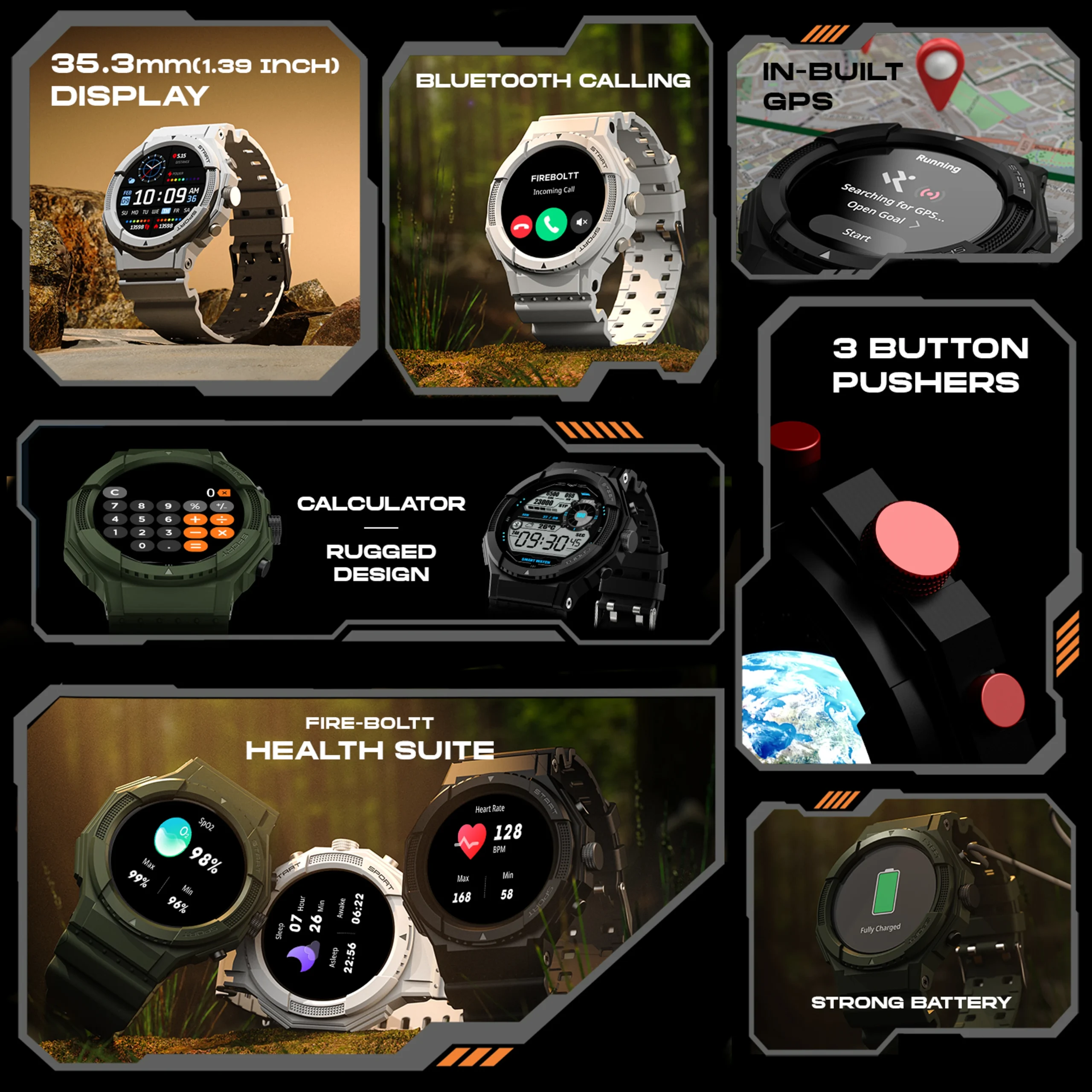Built-in GPS Tracking for outdoor activity tracking and navigation.