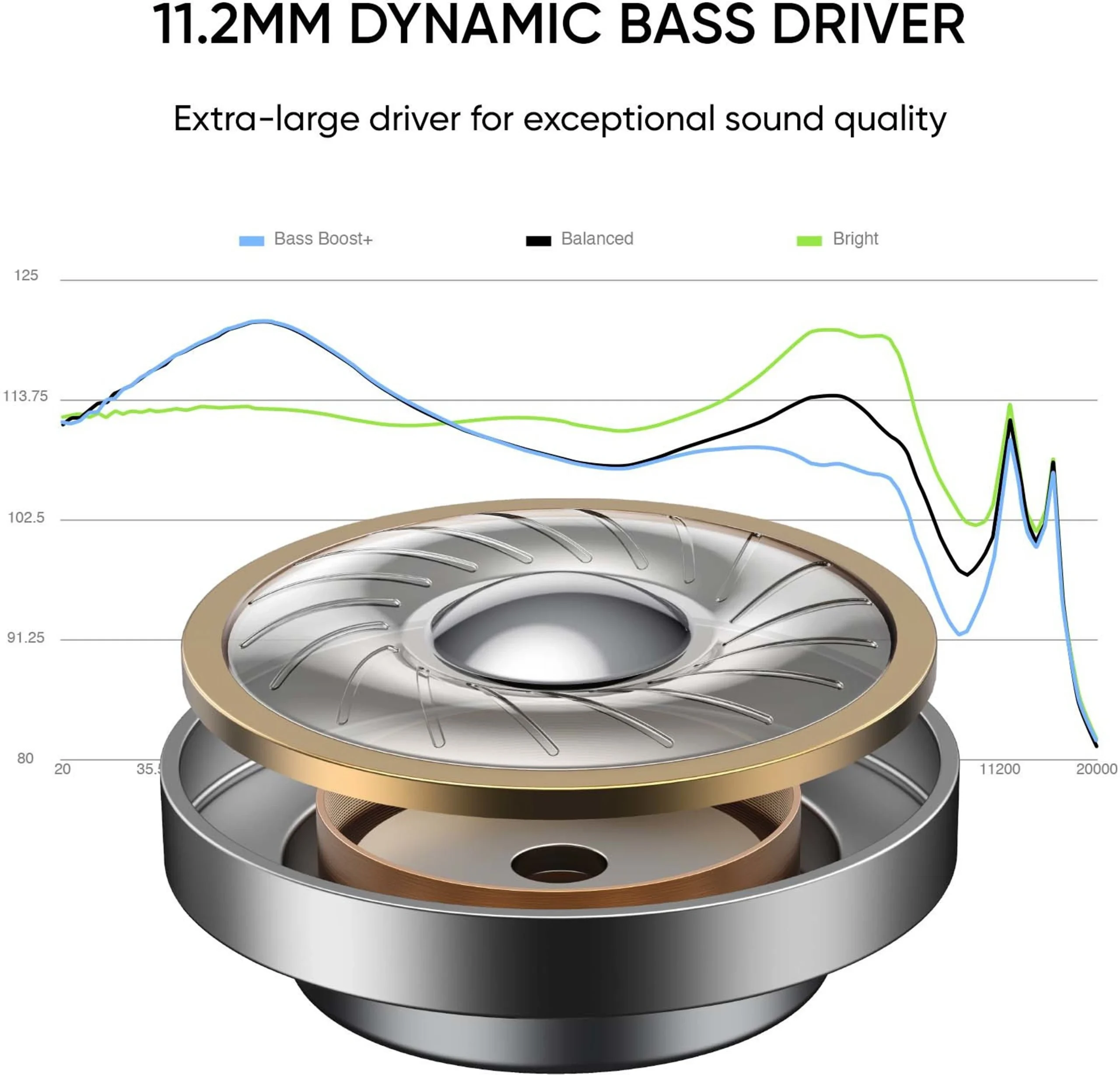 11.2mm Dynamic Bass Driver: A large, high-quality driver designed to produce deep, vibrating bass and clear high-frequency sounds.