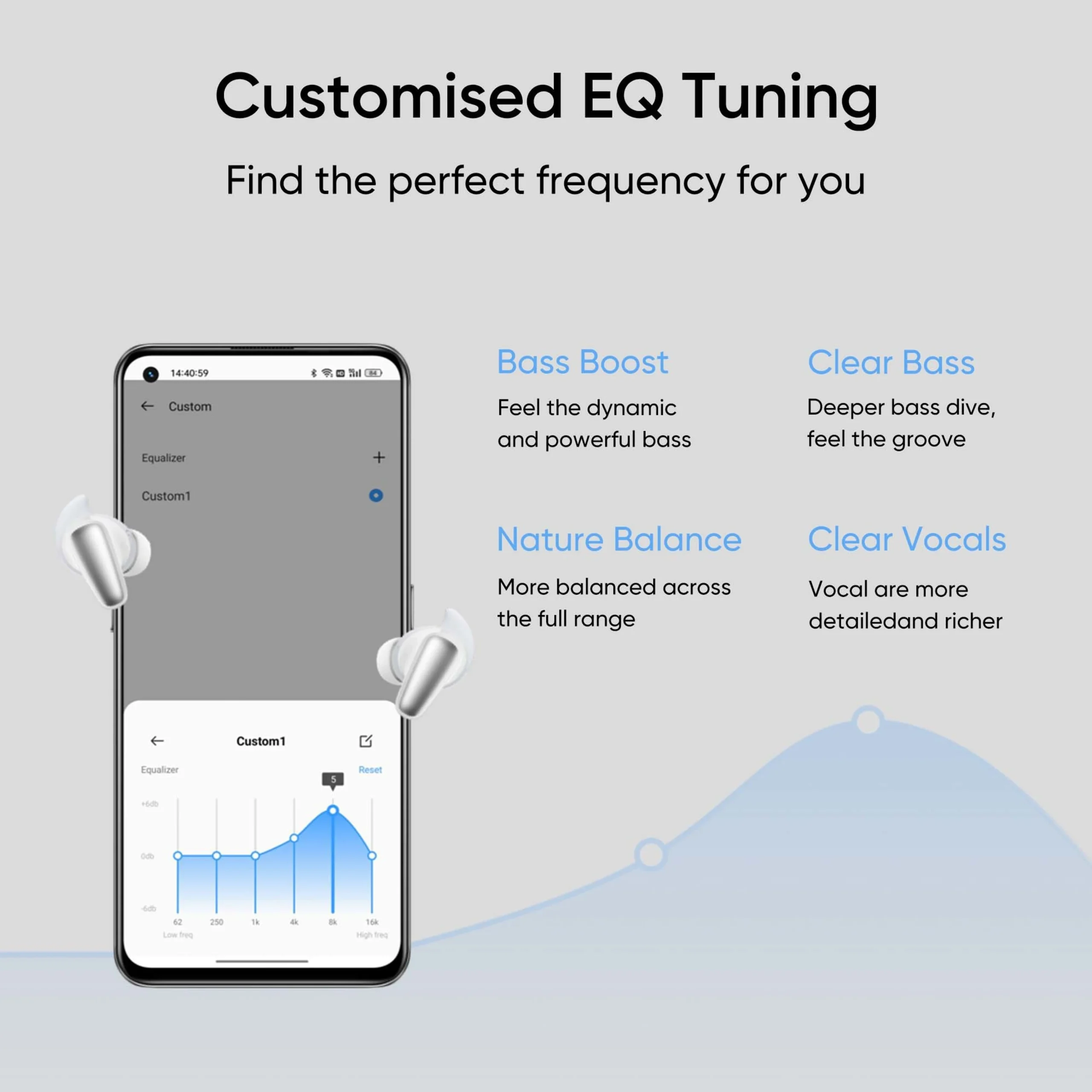Customized EQ Tuning: Access four pre-set sound modes (Bass Boost+, Clear Bass, etc.) or create your own via the Realme Link App.